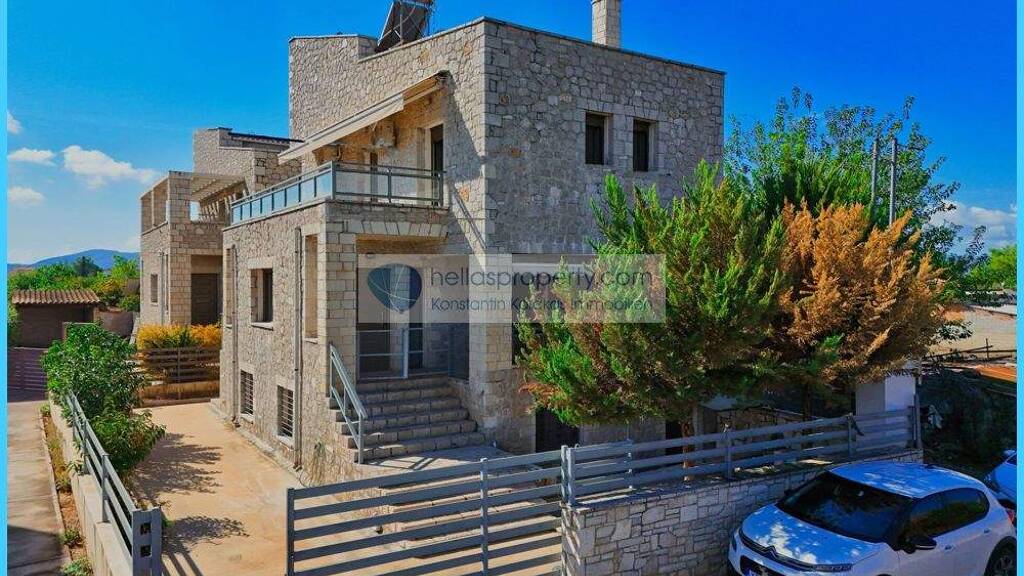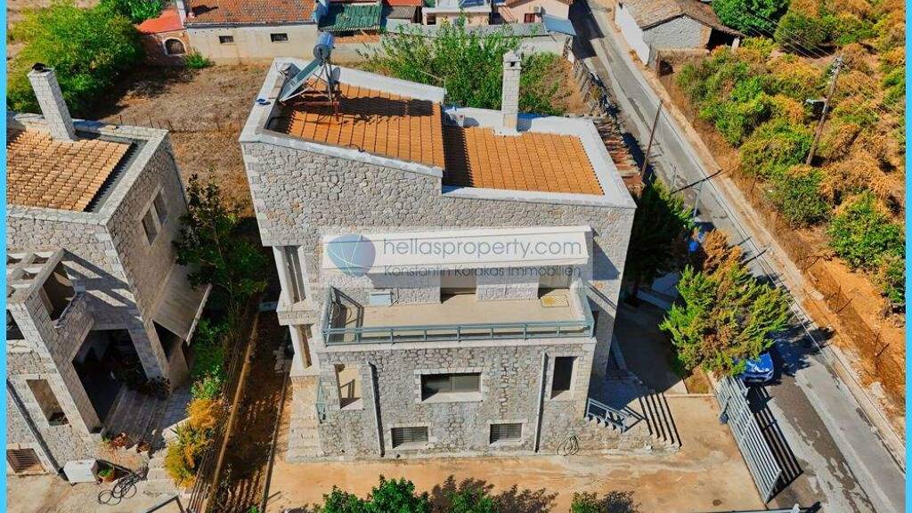 In einem Vorort von Nafplio steht ein beeindruckendes dreistöckiges Einfamilienhaus aus Stein mit Dachgeschoss zum Verkauf.