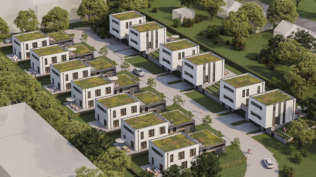 Die ortsansässige Firma M³ Immo hat die Bebauung des Areals übernommen und das Gebiet in Grundstücke von 379 m² bis 549 m² Größe aufgeteilt, die die Möglichkeit für eine Bebauung mit unterschiedlichen Fertigbau-Einfamilienhäusern bieten.