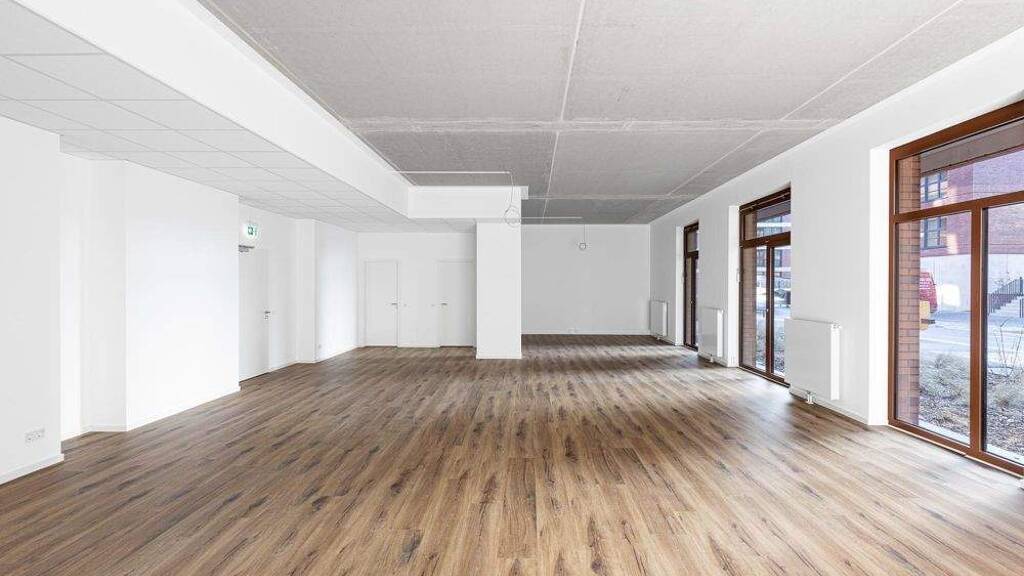 Alle Gewerbeeinheiten wirken durch den weißen Wandanstrich und die verklebten neutralen Tarkett-Kunststoffböden freundlich und modern. Die hohen Betondecken, mit den teilweise einsehbaren Versorgungsleitungen, geben den Geschäftsräumen einen industriellen Stil. Jedes Gewerbeobjekt verfügt über mindestens eine WC-Anlage. Die Versorgungsanschlüsse für den Einbau einer Teeküche sind jeweils vorhanden.