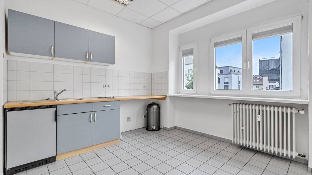 Die Bürofläche wird ergänzt durch eine praktische Teeküche, ideal für Pausen und Snacks, sowie modern geflieste, getrennte Damen- und Herren-WCs. Der Zugang zur Bürofläche erfolgt entweder über das Treppenhaus oder barrierefrei über einen stufenlosen Aufzug. Besonders hervorzuheben ist der private Innenhof, in dem ausreichend Stellplätze für Mitarbeiter und Besucher zur Verfügung stehen.