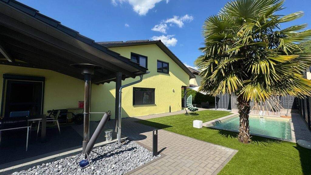Das sonnig gelegene Gartengrundstück ist überwiegend eben und mit Premium-Kunstrasen pflegeleicht angelegt. Genießen Sie den Pool unter Palmen und lassen Sie sich vom blickgeschützten Außenbereich bezaubern.