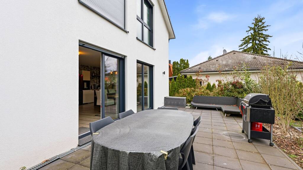 Ein absolutes Highlight ist die großzügige, ca. 40 m² große Terrasse, die nahtlos in den weitläufigen Privatgarten mit rund 240 m² übergeht. Der Garten bietet viel Platz zum Entspannen, Spielen oder für gesellige Stunden im Freien, wodurch eine besonders naturnahe und erholsame Wohnatmosphäre entsteht.