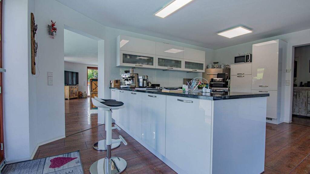 Die moderne Küche präsentiert sich mit einer hochwertigen weißen Einbauküche, einem integrierten Essbereich sowie einem zusätzlichen Holz-Ofen. Auch von der Küche aus besteht direkter Zugang zum Balkon, wodurch Innen- und Außenbereich harmonisch miteinander verbunden werden.