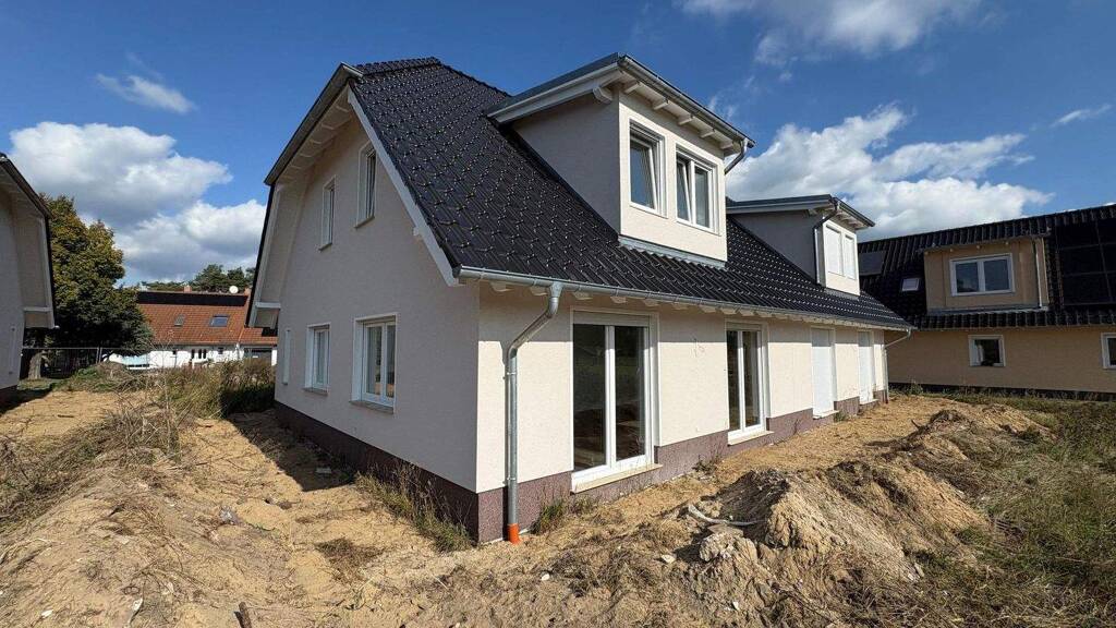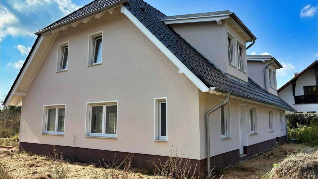 Die Häuser stehen jeweils auf einem 673m² großen Grundstück und verfügen jeweils über 4 geräumige Zimmer, 1 modernes Badezimmer und 1 Gäste-WC. Die Satteldächer sind mit hochwertigen Dachpfannen/-ziegeln gedeckt und die Fertigstellung ist voraussichtlich im Oktober 2025. Unterkellerung ist nicht vorhanden.