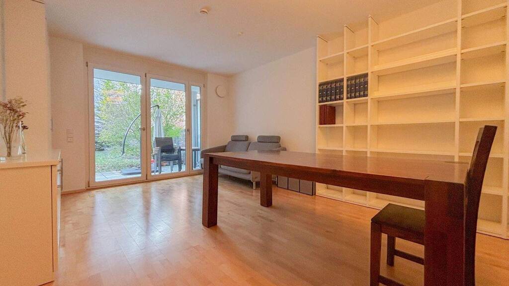 Über den großzügigen Eingangsbereich werden alle Räumlichkeiten der Wohnung erschlossen. Der Wohn- und Essbereich bietet über bodentiefe Fensterfronten den Zugang auf die Terrasse sowie den eigenen Garten in westlicher Ausrichtung.