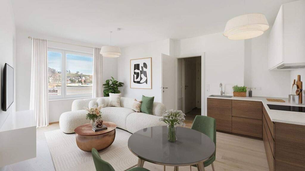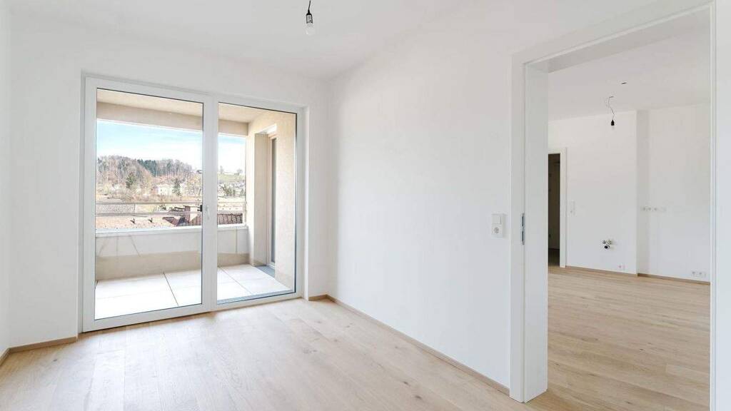 Die ruhig gelegene 2-Zimmer-Wohnung C40 befindet sich im Dachgeschoss von Baukörper C und ist mit einer Loggia ausgestattet. Die Wohnung ist hofseitig ausgerichtet und bietet eine schöne Sicht auf den Vöcklabrucker Grüngürtel und den historischen Stadtturm. Das Raumkonzept ist durchdacht und gemütlich.