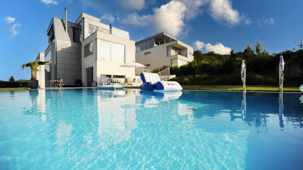 Die Immobilie punktet zudem mit durchdachten Highlights wie hochwertigen Einbauschränken von Steininger, einem Wäscheabwurfschacht auf jeder Ebene, einem In- und Outdoor-Pool mit Gegenschwimmanlage, einer Sauna, einem Heimkino und einem Fitnessstudio. Die Verwendung von weißem und schwarzem Marmor von Guio Piva sowie hochwertigem Parkett verleiht dem Haus eine zeitlose Eleganz.
