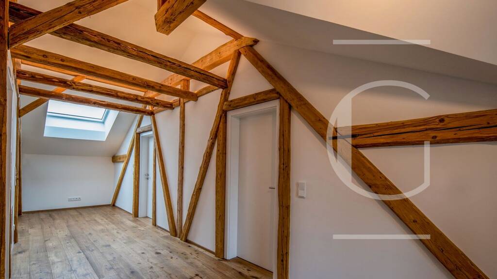 Das absolute Highlight des Gebäudes ist die Dachgeschosswohnung mit den aufwändig renovierten historischen Elementen. Diese wird ebenfalls über das erste Obergeschoss betreten, vom Vorraum aus gelangen Sie über die geschichtsträchtige Treppe in das Dachgeschoss. Betritt man den obersten Stock, sticht sofort die großzügige Raumhöhe mit dem originalen Fachwerk-Dachstuhl ins Auge. Die Einheit verfügt über eine Größe von ca. 71 m² bestehend aus einem Wohnraum, einer Designerküche mit anschließendem Essbereich, einem Duschbad und zwei Schlafzimmern. In einem der Schalzimmer wurde aufgrund der Raumhöhe eine zusätzliche Schlaf- und Lesegalerie eingezogen.