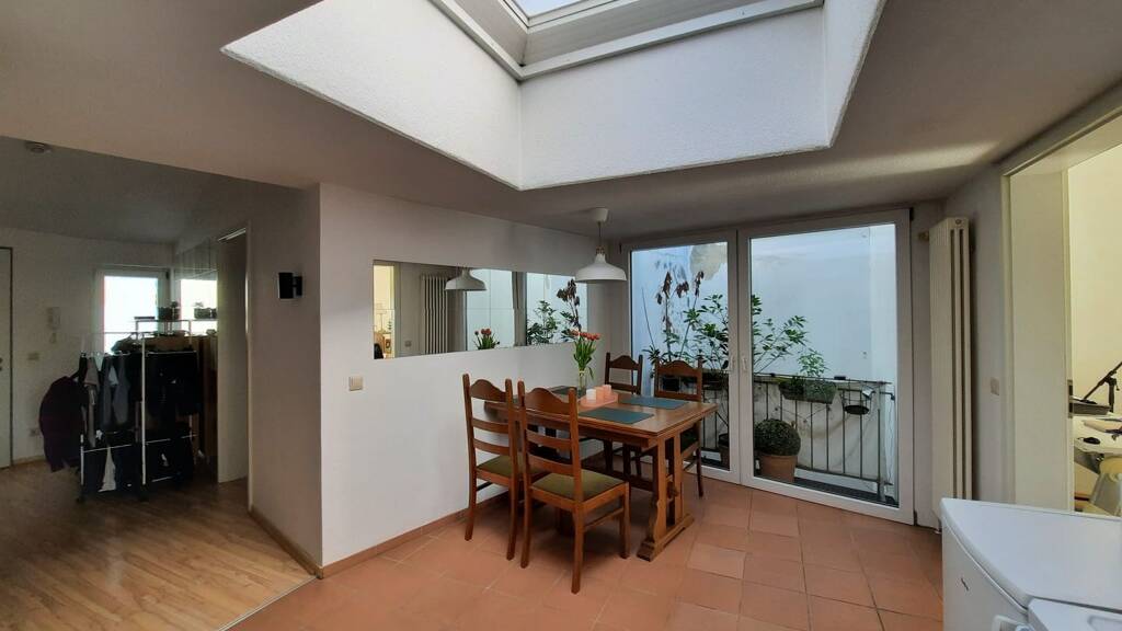 Die Wohnung verfügt über drei geräumige und helle Zimmer, ein Badezimmer, ein Gäste-WC, zwei Balkone sowie eine große Küche mit lichtdurchfluteten Essbereich.