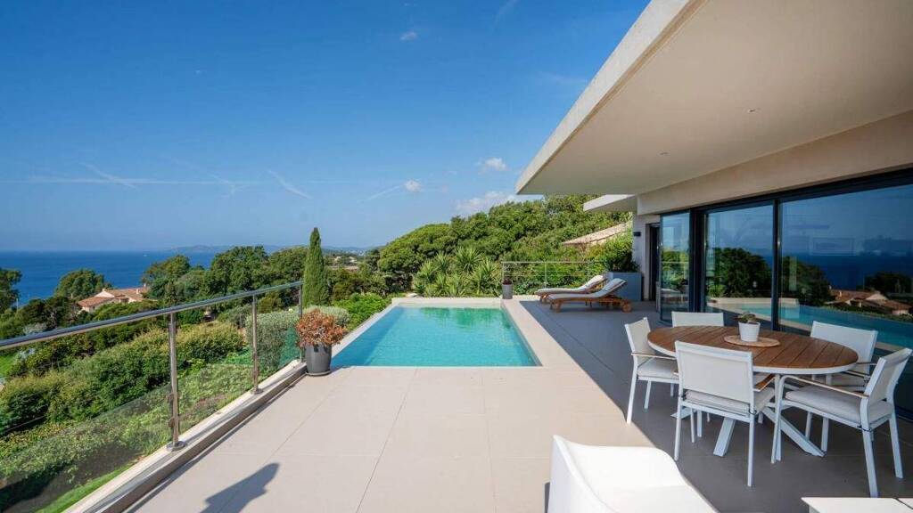In einer natürlichen Umgebung, 5 Minuten von den Stränden entfernt, befindet sich eine prächtige zeitgenössische Villa von 220 m², die 2013 von einem Architekten erbaut wurde und einen atemberaubenden Blick auf das Meer und die Goldenen Inseln bietet. Grundstück von 1.372 m² mit Infinity-Pool, 2 unabhängigen Ebenen, 4 Schlafzimmern, High-End-Dienstleistungen.