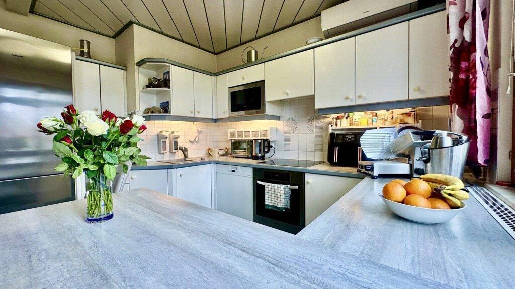 Die Einbauküche bildet einen zentralen Treffpunkt für gemeinsame Kochmomente und Gespräche. Der Kamin sorgt besonders in der kühleren Jahreszeit für eine warme, gemütliche Stimmung.