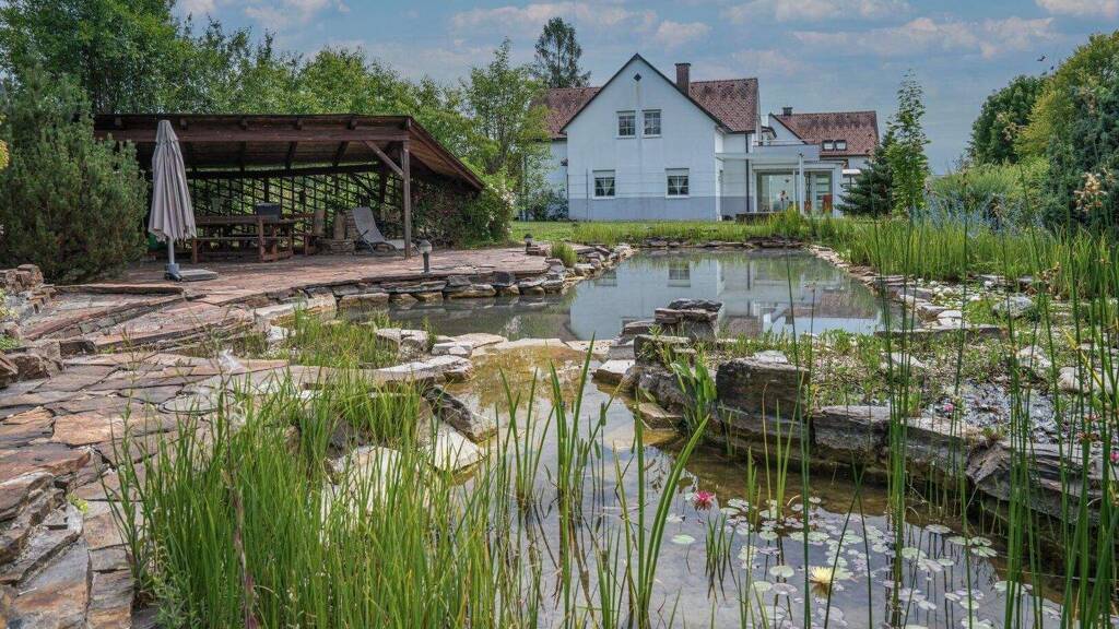 Der weitläufige Garten mit Grill, Schwimmteich, Wasserfällen, kleinen Sitzbereichen und wunderschönen Pflanzen ladet Sie zum Verweilen und Entspannen ein.