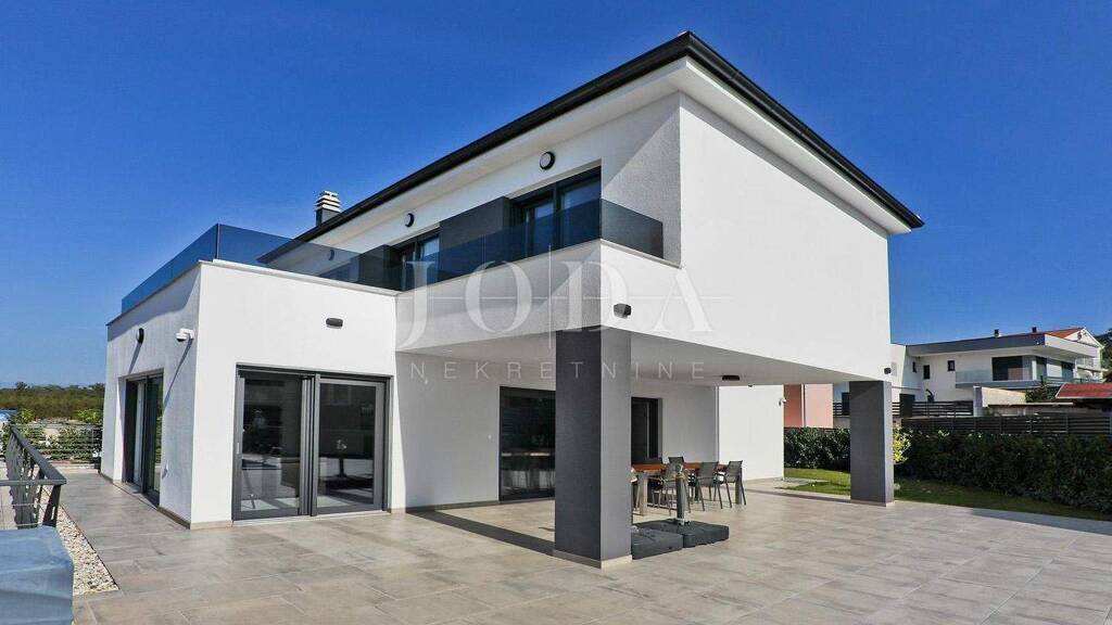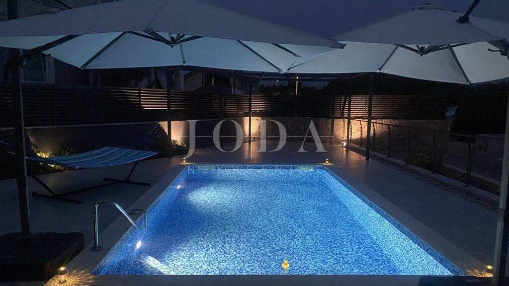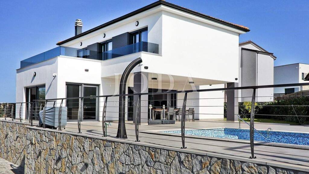 Das Erdgeschoss besteht aus einem Wohnzimmer, einer Küche, einer Gästetoilette, einem Schlafzimmer mit Bad (welches i.A als Abstellraum genutzt wird) und einem Technikraum. Im Obergeschoss befinden sich 3 Zimmer, davon 2 Schlafzimmer und ein Ankleidezimmer, welches problemlos in ein weiteres Schlafzimmer umgewandelt werden kann. Ein Schlafzimmer verfügt über ein eigenes Badezimmer, während ein weiteres Badezimmer separat ist. Alle Schlafzimmer öffnen sich auf die großzügige Terrasse. Die Zimmer im Obergeschoß haben einen herrlichen Blick auf das Meer und die Natur. Das Haus ist hochwertig gebaut und mit feiner Keramik ausgestattet. Alle Räume verfügen über eine Fußbodenheizung. Das Haus ist mit Überwachungskameras ausgerüstet. Im weitläufigen Garten befindet sich ein beheizter Salzwasser-Pool von ca. 24 m2. Schöne Lage, umgeben von Familienvillen, ca. 1000 Meter und 15 Minuten zu Fuß vom Zentrum von Malinska und dem Meer entfernt.