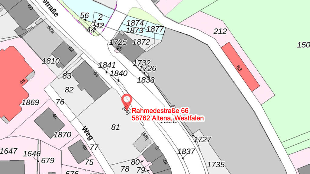 Das Grundstück liegt in der Rahmedestrasse in Altena. In der unmittelbaren Nähe bestehen zahlreiche Möglichkeiten zur Deckung des täglichen Bedarfs. Im weiteren Umkreis befindet sich die Burg Altena, dort befinden sich weitere Dienstleistungsangebote wie z.B. eine Bank oder zahlreiche Restaurants.