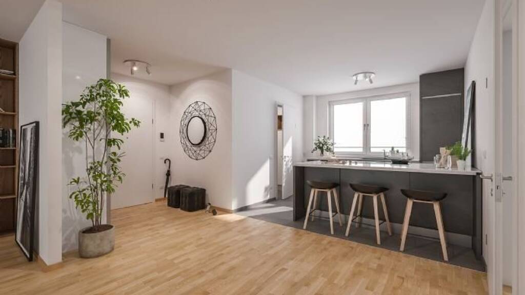 Heller und groĂźzĂĽgiger Grundriss - heller und ebenso groĂźer und nutzbarer Balkon. Offene KĂĽche zum Wohnzimmer und praktischen Abstellraum direkt angrenzend mit SchiebetĂĽr. Das Wohnzimmer mit Zugang zum Balkon grenzt am ebenso groĂźen Schlafzimmer an. Die Wohnung ist so gut wie fertig gestellt und kann nach Auswahl der Fliesen fĂĽr Sie innerhalb 4 Monaten nach Notartermin fertiggestellt und fĂĽr Sie oder Ihren Mieter bezugsfertig gemacht werden.