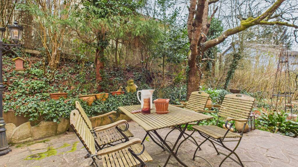 Die Diele empfängt Sie mit klassischen Jugendstil-Fliesen und einer warmen Atmosphäre. Rechterhand befindet sich das modernisierte Gäste-WC. Gegenüberliegend gelangen Sie in die großzügige Küche, die mit einer maßgefertigten Schreiner-Einbauküche ausgestattet ist. Von hier aus haben Sie Zugang zur Terrasse und dem gepflegten Garten - ein perfekter Ort zum Entspannen oder für gesellige Stunden.