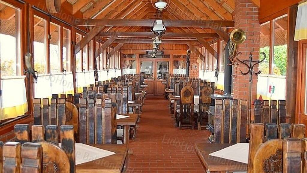 -Das strohgedeckte Gasthaus mit zwei Außenöfen und einem 218 m2 großen Weinkeller erinnert an die Aromen der traditionellen ungarischen Küche. Es bietet Platz für 120 Personen im Winter und 500 Personen im Sommer.