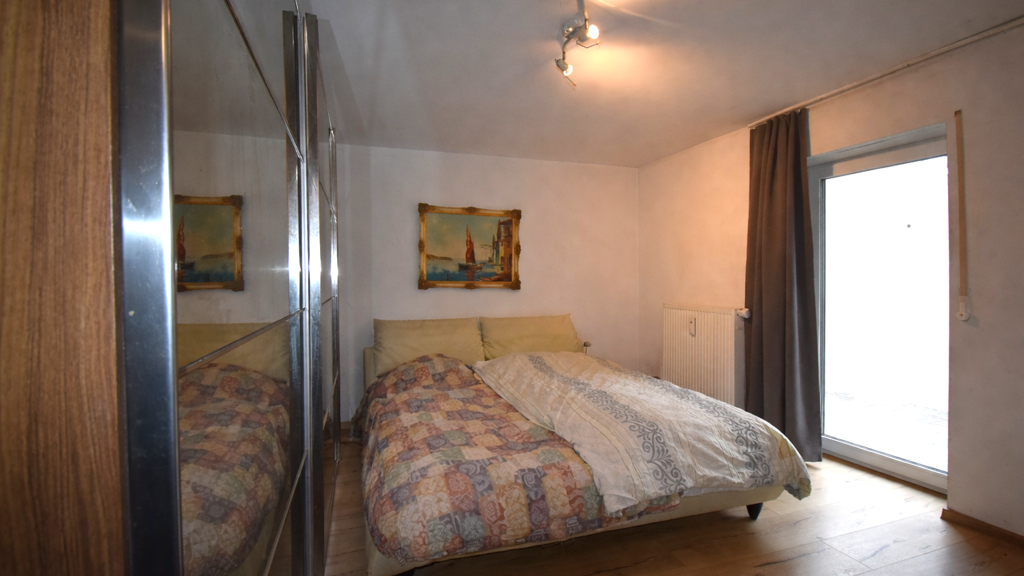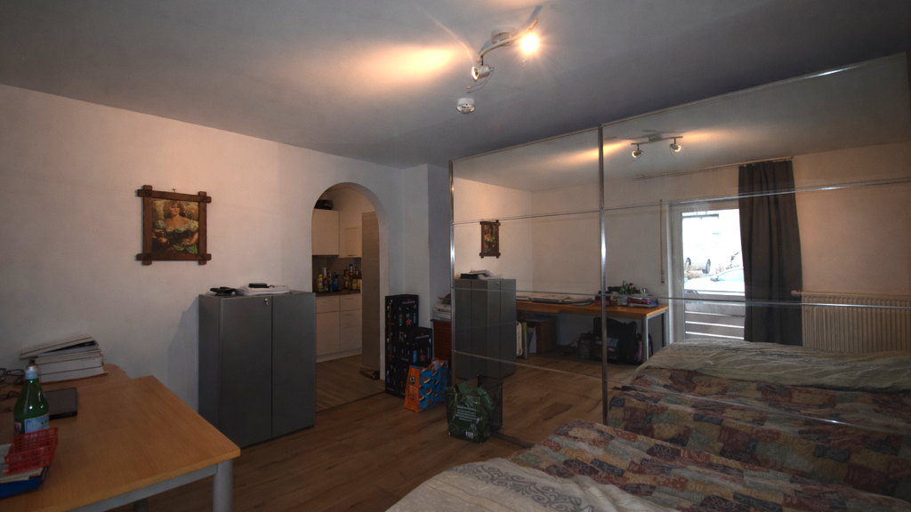 •Lichtdurchfluteter Wohn- & Schlafbereich: Der großzügige Hauptraum bietet ausreichend Platz für ein großes Bett sowie einen Arbeits- oder Essbereich. Die große Spiegelfront des Einbauschranks (optional/vorhanden) sorgt für zusätzliche optische Weite