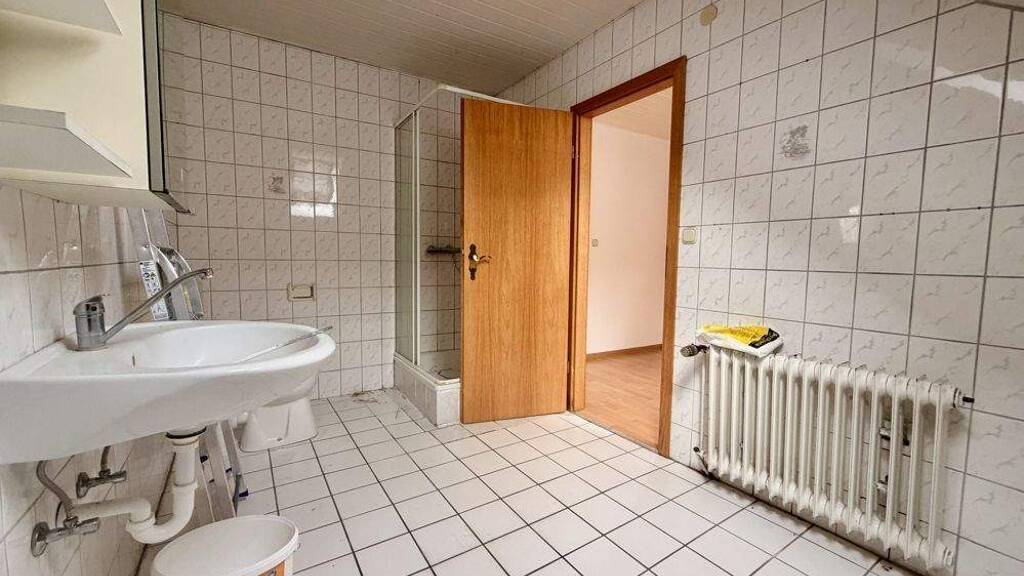 Über die Treppe im Flur gelangen Sie in das Obergeschoss. Dort erwarten Sie ein geräumiges Schlafzimmer mit ca. 16,34 m² sowie ein weiteres Zimmer mit ca. 12 m², das sich ideal als Kinder-, Gäste- oder Arbeitszimmer eignet. Das Tageslichtbad ist mit Dusche und WC ausgestattet. Ein weiterer Abstellraum, in dem sich auch die Heizungsanlage befindet, bietet zusätzlichen Stauraum.