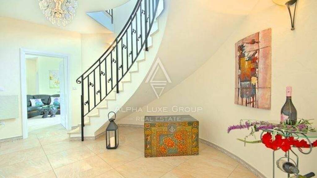 Auch der Außenbereich ist beeindruckend - ein liebevoll angelegter mediterraner Garten, ein Pool mit Sonnenbereich, überdachte Lounge-Zonen zum Entspannen und geselligen Beisammensein sowie ein bezaubernder panoramischer Meerblick, der das luxuriöse und entspannende Ambiente perfekt abrundet.