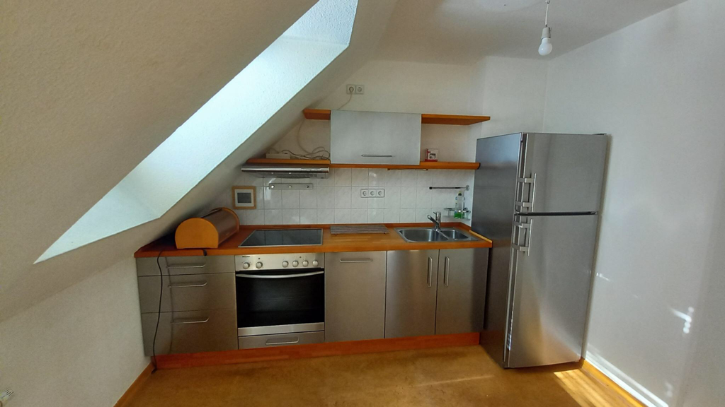 Wohnzimmer mit abgetrenntem Küchenbereich, Schlafzimmer, Flur. Dachflächenfenster. Ein französisches Fenster zum Weit aufklappen. Großes, hell gefliestes Wannenbad mit Fenster. Die Whg ist gerade frisch renoviert/gestrichen worden. Laminatboden im gesamten Wohnbereich, außer im Schlafzimmer.