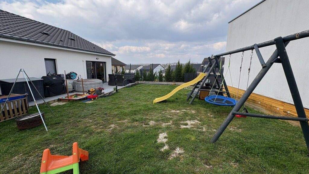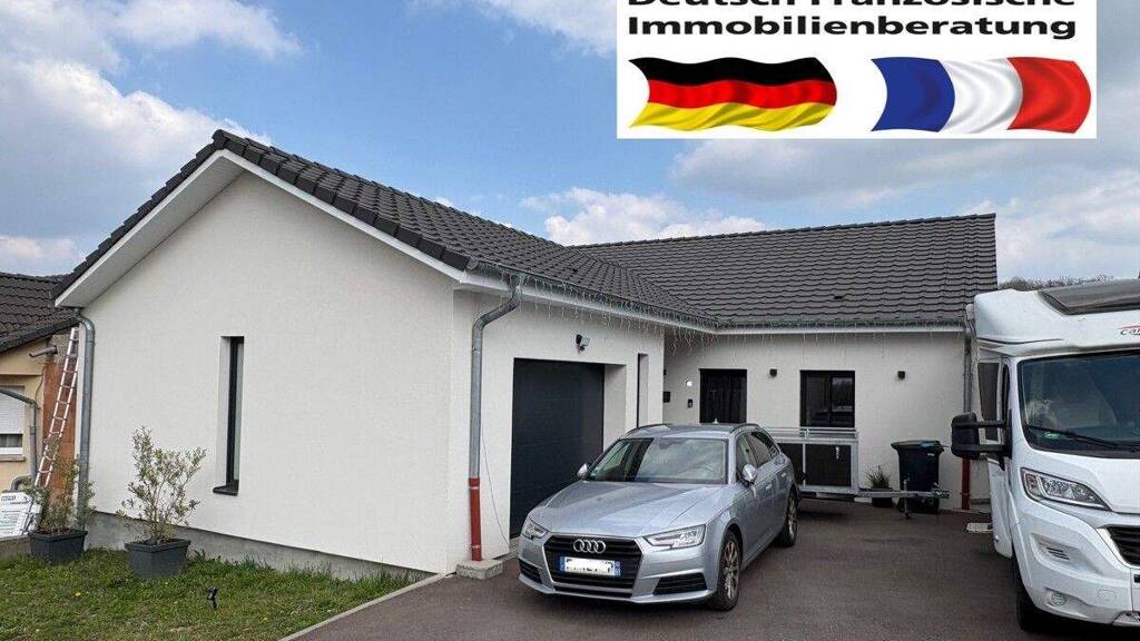 Angeboten wird ein Bungalow in Farebersviller. Wohnen auf einer Ebene. Gebaut in 2023, fertig gestellt in 2024. Aufteilung: Eingangsbereich - Garage mit ca 27m² Fläche - WC - Wohn und Esszimmer mit moderner Einbauküche und Austritt zur Terrasse und Garten - 3 Schlafzimmer - Bad mit Dusche und Badewanne