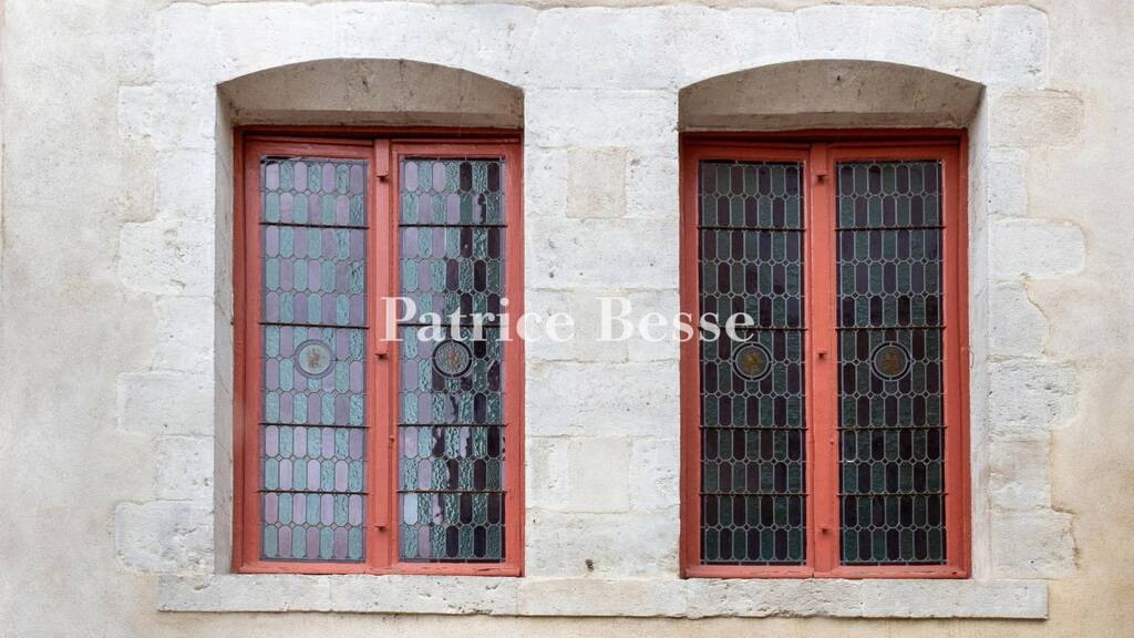 As for the rectangular dwelling, which stands on the corner and is topped with a slate gable roof, it has kept its original architecture and features four storeys over a vaulted cellar. Facing east and north, its understated and partially asymmetrical exteriors are covered in plaster with ashlar stone window/door surrounds and quoins, whereas an old wooden door and rectilinear windows, in an array of sizes, fitted with colourful stained glass or small panes, cadence the first three floors of the dwelling.
