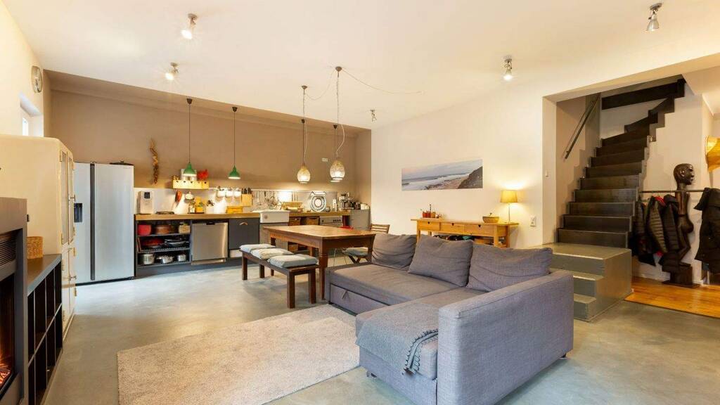 Das Entrée bietet eine geräumige Garderobe mit Zugang zum offenen Wohn-/Ess- und Kochbereich sowie zu einem separierten Schlafbereich mit Badezimmer en Suite mit Fenster und Dusche. So zumindest die aktuelle Nutzung - der Zugang auf eine private Terrasse kann ebenfalls als zweiter Eingang genutzt werden. Ein Gästebereich, ein Schlafzimmer oder ein Arbeitsbereich: der repräsentative Bereich lässt viele Nutzungsmöglichkeiten zu und ganz individuell gestaltet werden. Die intelligente Aufteilung ermöglicht Wohnen und Arbeiten unter einem Dach. Das Herzstück der Immobilie ist der weitläufige Wohn-, Ess- und Kochbereich. Hohe Decken (3,30 m), ein moderner Boden in Betonoptik und die offene Design-Treppe kreieren ein beeindruckendes Raumgefühl. Während der Kamin an Winterabenden für behagliche Wärme sorgt, erweitern die bodentiefen Fenster den Wohnraum im Sommer auf die sonnige Süd-Terrasse.