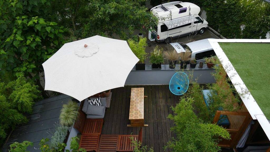 Das Obergeschoss, welches über die stylische, offene Treppe erreicht wird bietet neben einem offenen Raum, der sich wunderbar als Office nutzen lässt, einen weiteren Schlafbereich mit Duschbadezimmer en Suite. Highlight ist der Zugang zur großen Dachterrasse mit Außensauna. Durch die Bepflanzung und Sonnenschirme ist ein sehr guter Sichtschutz gegeben, eine gemütliche Lounge findet ebenfalls Platz und bietet einen tollen Spot im Freien.