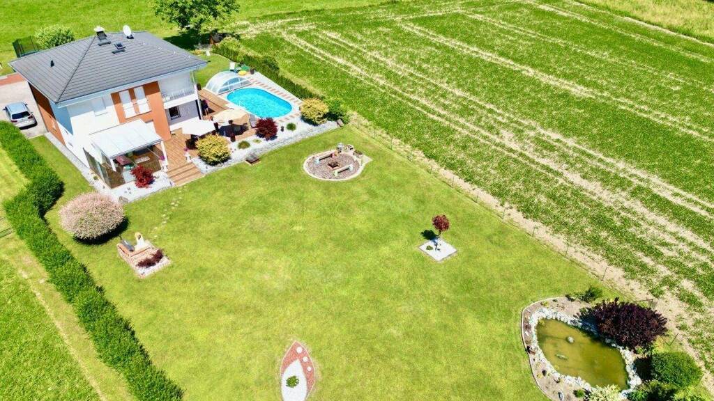 Der liebevoll gestaltete Garten ist ein echtes Highlight: Ein Stahlwandpool mit Kuppel, ein Biotop, ein Grillbereich sowie mehrere Rückzugsorte laden zu entspannten Stunden im Freien ein. Balkon und Terrasse mit Sommergarten (kein Wintergarten) eröffnen einen traumhaften Fernblick über die umliegende Landschaft und erweitern den Wohnraum in den warmen Monaten auf besondere Weise.