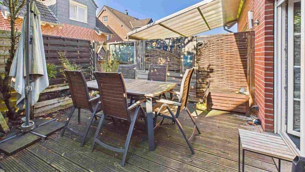 Von hier aus gelangen Sie direkt auf die Terrasse und in den pflegeleicht angelegten Garten. Der Terrassenbereich ist mit Holz belegt und bietet eine schöne Grundlage für Ihre persönliche Wohlfühloase - mit einem grünem Daumen lässt sich der Außenbereich wunderbar aufwerten.