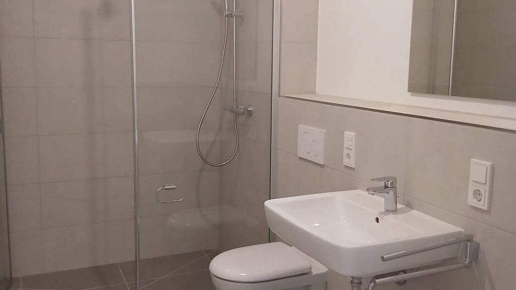 Das hell geflieste Badezimmer ist mit einer modernen Dusche ausgestattet. Ein Handtuchheizkörper sorgt für zusätzlichen Komfort.