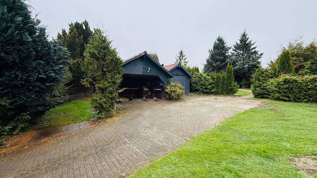 Das Grundstück ist bereits bebaut mit einem Carport, einer Garage und einem Pavillion.