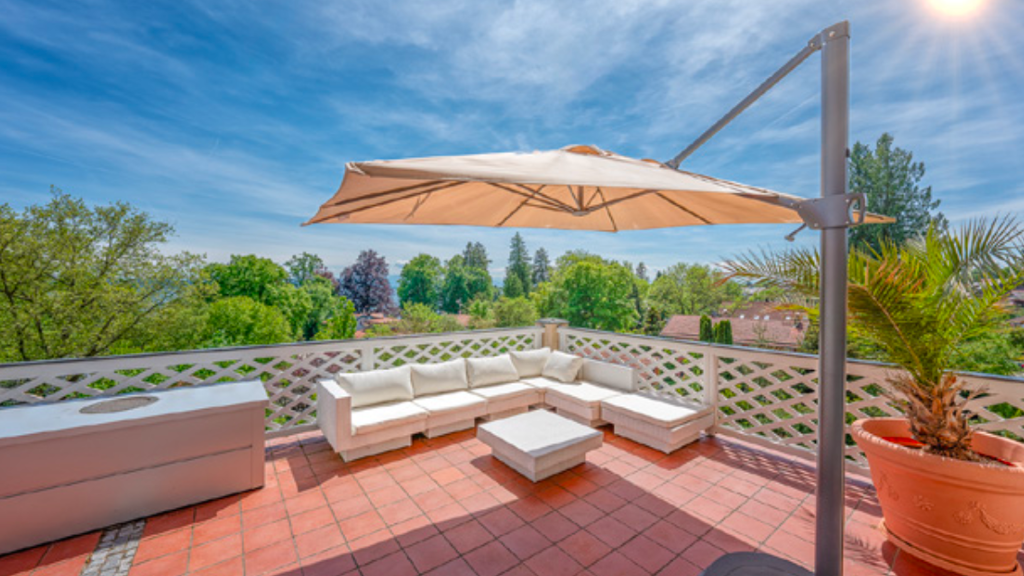 Über die vier Ebenen der Villa mit ihren großzügigen Terrassen und sonnigen Balkonen steigert sich der Blick von Stockwerk zu Stockwerk auf die umliegende Landschaft und den See. Abgerundet wird das Anwesen durch einen parkähnlichen und von außen kaum einsehbaren Garten mit Koiteich, Wasserbrunnen und Pavillon.