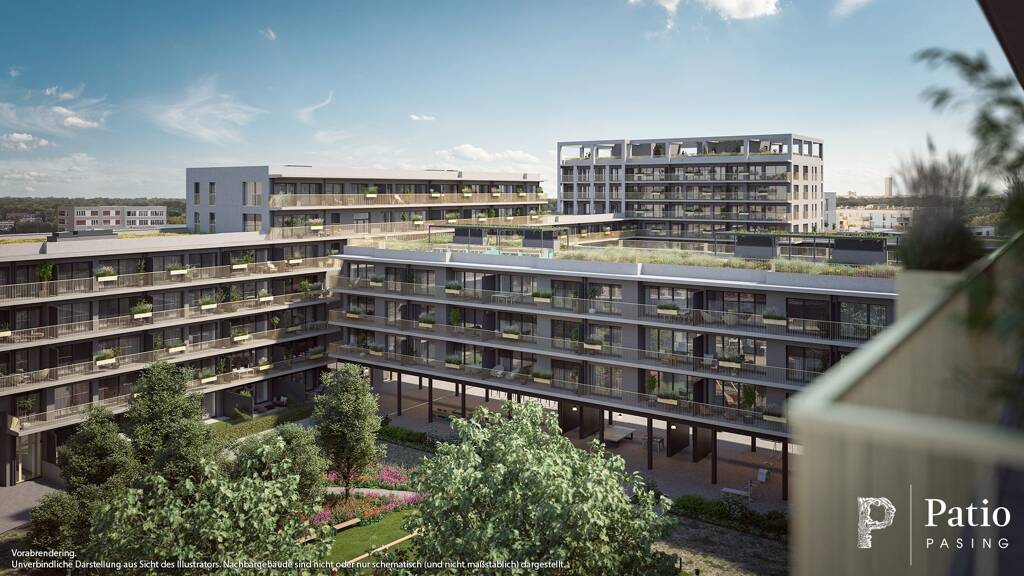 Lebendig und urban, grün und ruhig, modern und vielfältig: Patio Pasing steht für abwechslungsreiches städtisches Wohnen in stilprägender Hof-Architektur. Mit Patio Pasing entstehen facettenreiche 1- bis 4-Zimmer-Eigentumswohnungen. Jede Wohnung verfügt über eine hochwertige Markenausstattung mit Wahlmöglichkeiten sowie größtenteils über eine großzügige Terrasse, Balkon, Dachterrasse oder über eine geschützte Loggia als "grünes Zimmer" im Freien.