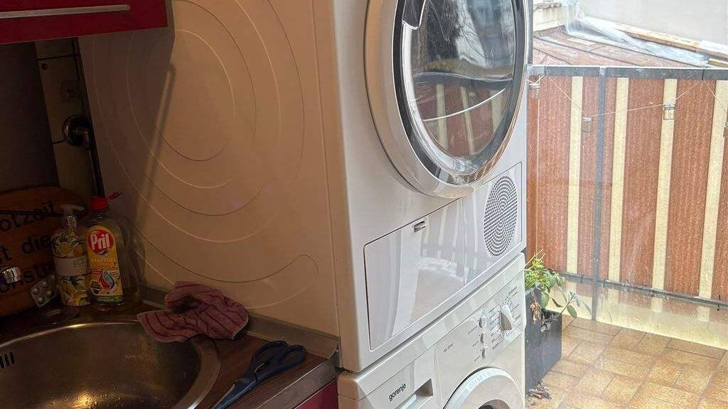 Rechts neben dem Badezimmer befindet sich die Küche. Die Einbauküche ist vollständig im Angebot enthalten und umfasst sämtliche Elektrogeräte - einschließlich Waschmaschine und Trockner. Von der Küche aus gelangen Sie direkt auf den Balkon, der zusätzlichen Freiraum bietet und zum Entspannen im Außenbereich einlädt.
