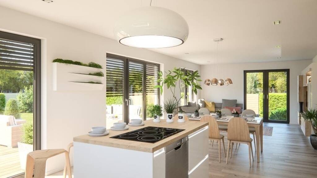 Die asymmetrische Fassadengestaltung lässt das Life 165 von außen extravagant wirken. Dahinter verbirgt sich jedoch ein praktisch und klug geplantes Innenleben. Bewährt ist der große Wohn- und Essbereich mit offener Küche, sowie eine große Speisekammer.
