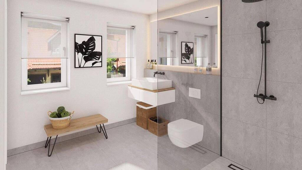 Bemerkungen: - Ökologisch nachhaltiges Energiekonzept (KFW 40 QNG Standard) - Premium Ziegel der Marke Schlagmann, Massivbauweise - 3- Lagen Putz - Kunststoff Fenster, 3 - fach Fensterverglasung - Fensterbänke innen in Naturstein - Hochwertige Parkettböden und Fliesen in allen Räumen - Druchdachte Aufteilung - El. Rollläden - Abstellraum - Feuchtigkeitslüfter mit Feuchtesensor im Bad - Großzügiges Bad mit Dusche - Großzügige Terrasse oder Balkon für entspannte Abende - Abschließbare Abstellraum für Fahrräder usw - Effiziente Fußbodenheizung für angenehme Wärme in allen Wohnräumen, separat regulierbar - Namhafte Luft-Wärme-Pumpe - Stellplätze - Hochwertige Glasgeländer auf den Balkonen - Lift / Personenaufzug - PV Anlage inkl. Speicher für den Allgemeinverbrauch (bspw Treppenhaus, Beleuchtung)