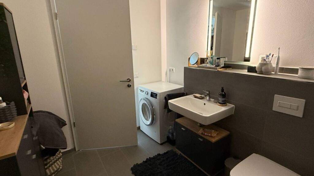 Ein moderner, betonfarbener Boden im Bad verleiht der Wohnung eine zeitgemäße Optik. Das Badezimmer besticht ohnehin durch eine große, bodengleiche Walk-In Dusche sowie einen praktischen Handtuchheizkörper und einen beleuchteten Spiegel.