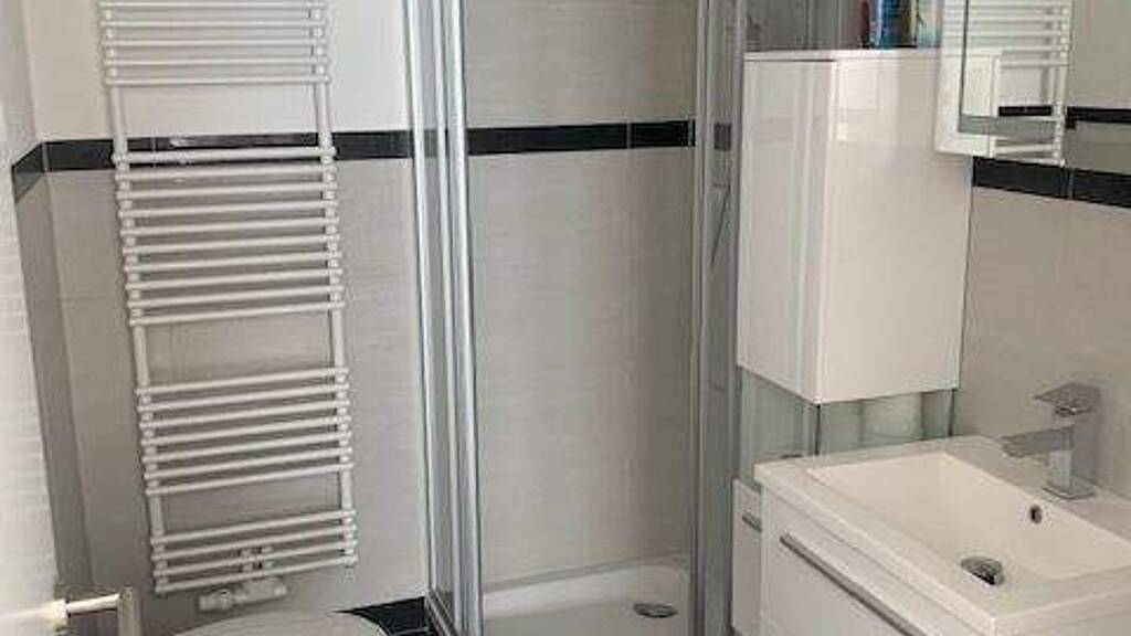 Zur Wohnung gelangen Sie über die Terrasse. Durch den Eingangsbereich/Diele erreichen Sie den Küchenbereich und den Abstellraum. Aus dem Eingangsbereich gehen Sie in das Wohn/Schlafzimmer und weiterhin in das Bad. Das innen liegende Badezimmer ist großzügig ausgestattet mit Dusche und zusätzlichen Handtuchheizkörper. Die Küche ist mit einer Einbauküche versehen.
