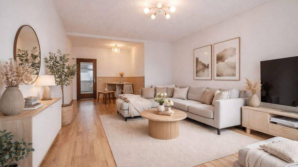 Das Herzstück der Wohnung ist das lichtdurchflutete Wohnzimmer, das nahtlos in den Essbereich übergeht. Die großen Fenster lassen viel Tageslicht herein und sorgen für eine angenehme, offene Atmosphäre. Auch das Schlafzimmer ist sehr hell und bietet einen Rückzugsort zum Entspannen.