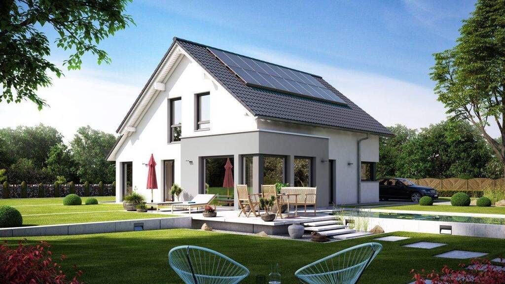 Kompromisse waren gestern, mit diesem Einfamilienhaus werden deine Eigenheimträume wahr. Dieses individuell gefertigte Fertighaus von Living Haus bringt alle Vorzüge moderner Architektur und flexiblen Wohnens zusammen. Mit einer Wohnfläche von 143 Quadratmetern auf zwei Etagen bietet es ausreichend Platz für Familien und Freiraum für Kreativität. Das klassische Satteldach mit einer Neigung von 38 Grad verleiht dem Haus einen zeitlosen Charakter, während die Erker den Wohnraum erweitern und durch bodentiefe Fenster viel natürliches Licht hereinlassen.