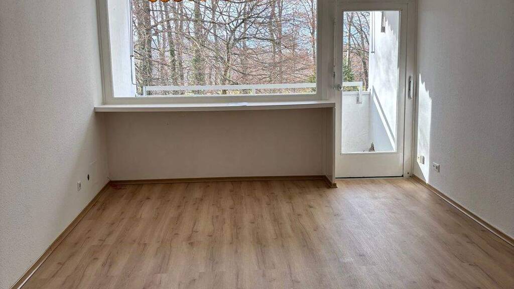 Die Wohnung verfügt über insgesamt drei Zimmer. Der offene Grundriss schafft eine luftige und einladende Atmosphäre. Das Wohnzimmer bietet ausreichend Platz für gemütliche Abende und führt direkt auf den Balkon. Das Schlafzimmer bietet genug Raum für ein großes Bett und einen Kleiderschrank.
