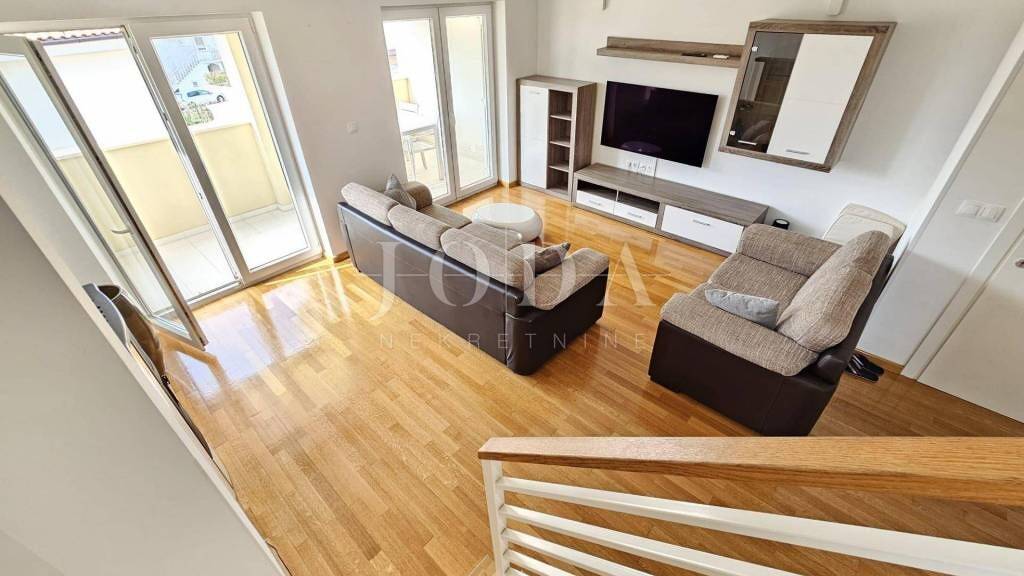 Die 100 m2 große Wohnung ist auf zwei Etagen aufgeteilt. Auf der ersten Etage ist ein geräumiges Wohnzimmer mit Ausgang zur Loggia mit Teilmeerblick, eine Küche mit Esszimmer und ein Badezimmer. Auf der zweiten Etage befinden sich ein Flur, ein Badezimmer und drei Schlafzimmer, von denen zwei Zugang zur Loggia mit freiem Meerblick haben. Die beiden Etagen sind mit einer Innentreppe verbunden.