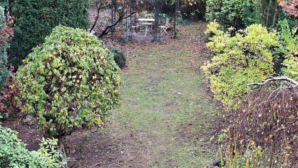 Neben der großen Terrasse ist im Garten eine Laube vorhanden.