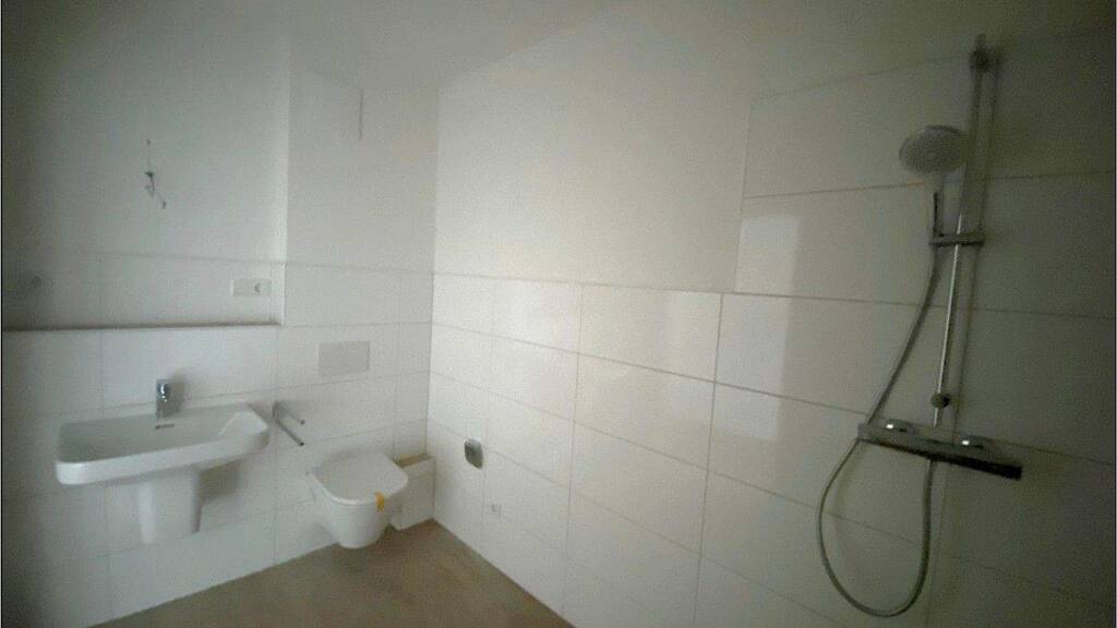 Über den Eingangsbereich betreten Sie die helle und freundliche ca. 61,00 m² große Wohnung. Links vom Eingang befindet sich das Schlafzimmer, das ausreichend Platz für ein großes Bett und einen Kleiderschrank bietet. Geradeaus vom Flur gelangen Sie in einen praktischen Abstellraum mit Waschmaschinenanschluss, der zusätzlichen Stauraum bietet. Rechts vom Eingang befindet sich das modern ausgestattete Badezimmer mit Waschbecken, WC sowie einer ebenerdigen Dusche mit Ablaufrinne. Am Ende des Flures erreichen Sie den offenen Wohn- und Essbereich mit moderner Einbauküche, der den Mittelpunkt der Wohnung bildet. Die Küche verfügt über hochwertige Elektrogeräte wie Backofen, Ceranfeld, Geschirrspüler und Kühl-/Gefrierkombination. Von hier aus haben Sie direkten Zugang zur Terrasse.