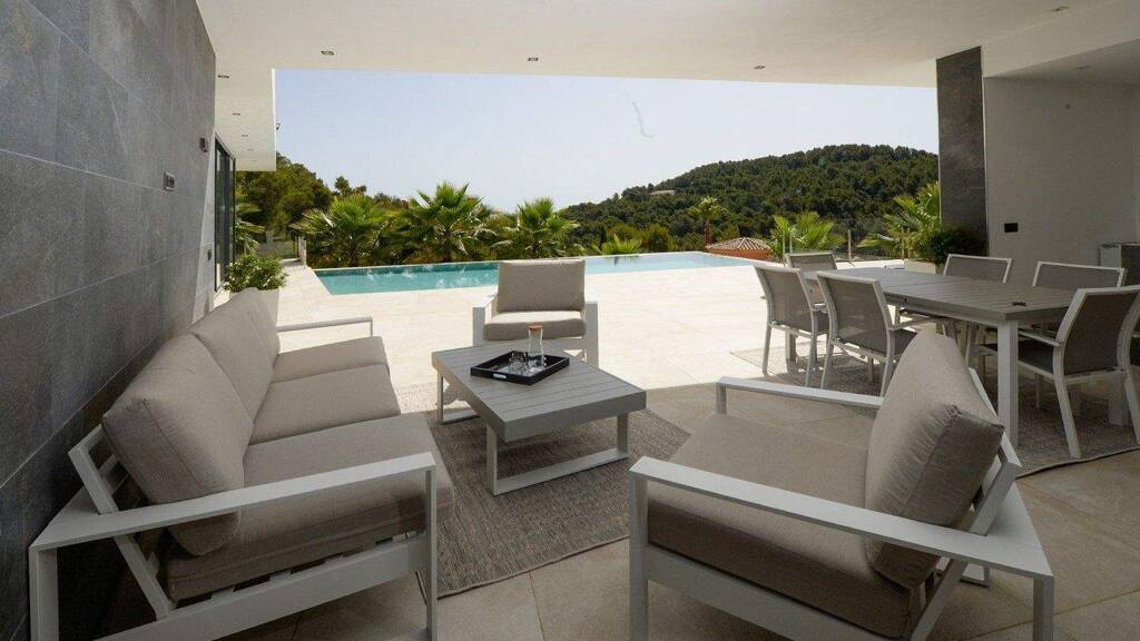 Diese stilvolle moderne Villa befindet sich in hervorragender Lage in der begehrten Urbanisation Tosalet 5 in Jávea und bietet einen offenen Blick über die grünen Hügel bis hin zum Meer. An klaren Tagen reicht der Blick sogar bis zur Insel Ibiza am Horizont.