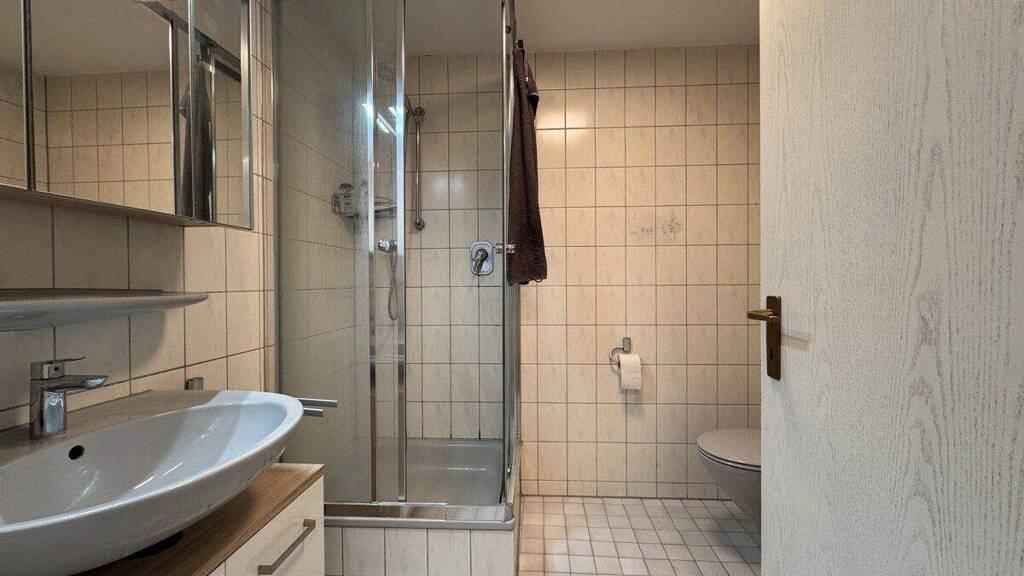 Das Badezimmer ist mit Dusche, WC und Handwaschbecken ausgestattet und verfügt zudem über einen praktischen Waschmaschinenanschluss. Die kompakte, gut strukturierte Aufteilung der Wohnung ermöglicht eine effiziente Nutzung der Wohnfläche.
