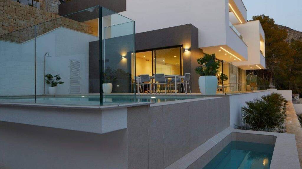 Die Villa ist außerdem mit einem Aufzug, einem Sicherheitssystem, Fußbodenheizung, Klimaanlage, technischer Beleuchtung und Gartenbereichen ausgestattet. Design, Ausstattung, Qualität und ein atemberaubender Blick auf das Mittelmeer erwarten Sie in Altea, an der Costa Blanca Nord.