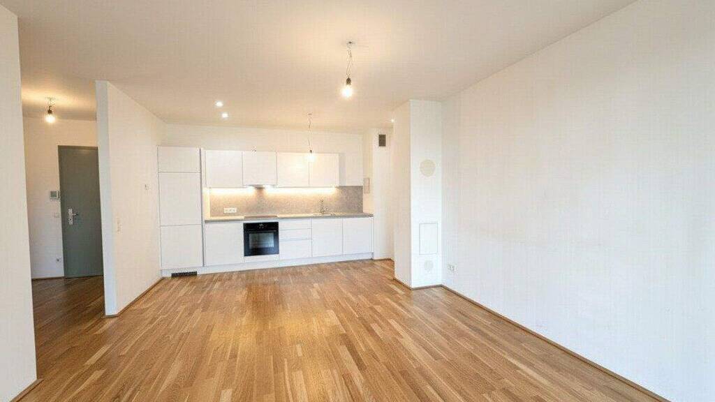 Der helle Wohnraum mit offener Kochnische bildet das Herzstück der Wohnung und schafft ein angenehmes Wohnambiente. Die Einbauküche ist derzeit noch nicht installiert, wird jedoch vor Übergabe neu eingebaut und vollständig ausgestattet mit: